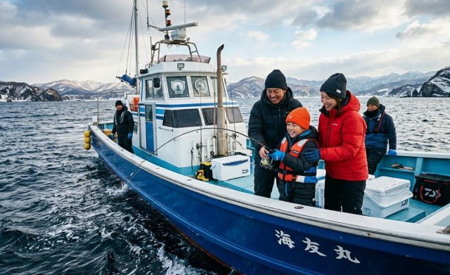 防寒着を着て船に乗り込み、プロのレクチャーを受けながら冬の海で本格的な海釣りに挑戦する。