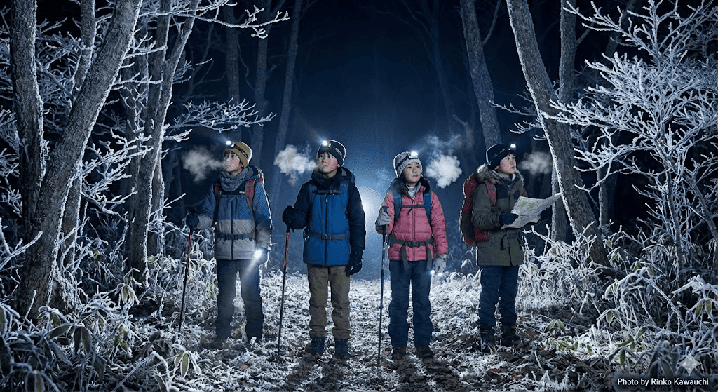 暗く寒い冬の外へ出て、凍った草や水、音や感触など冬特有の自然を自分で探し、確かめる。 発見したことを言葉にすることで、考える力と成長を親子で実感できる探検体験。