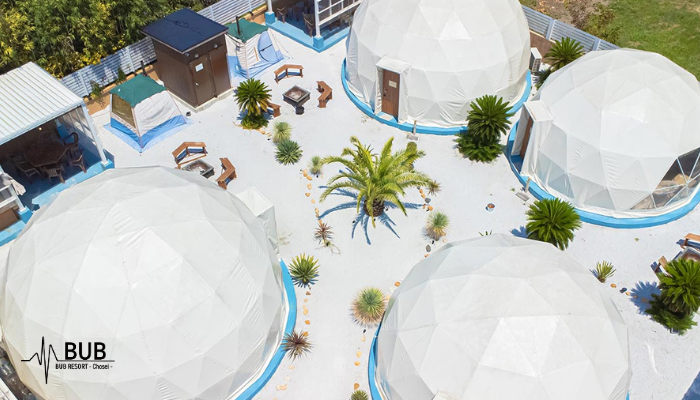 千葉御宿の海水浴場すぐそばにあり、4棟のドームテントが設置されています。