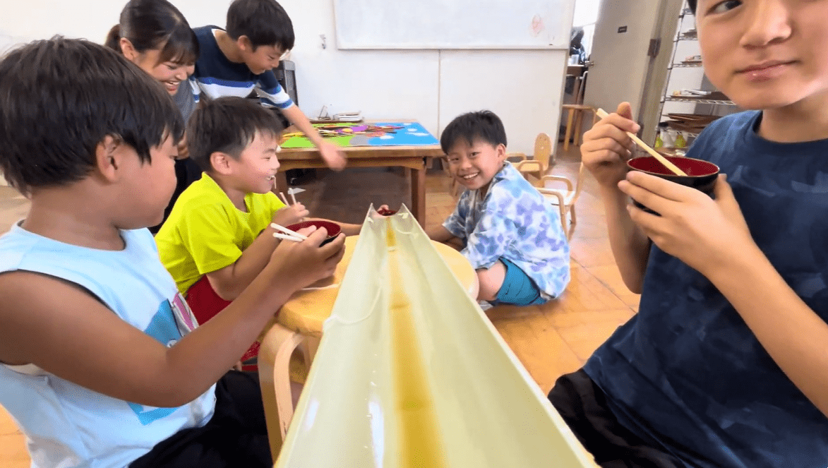 完成した流しそうめんを楽しみます。